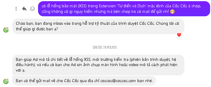 | Dec 31, 2025 | Cốc Cốc acknowledged receipt via Facebook and forwarded to dev team |