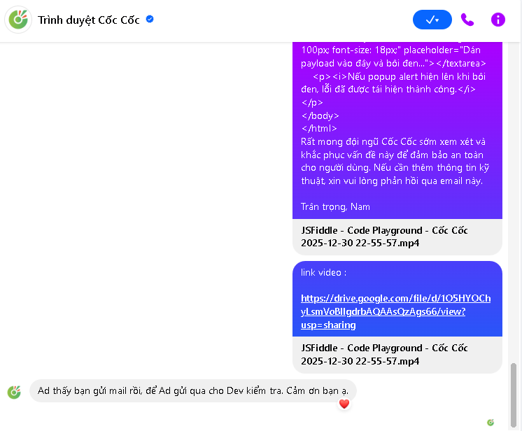 Thanks to the Cốc Cốc technical support team for acknowledging the report and coordinating the fix.
