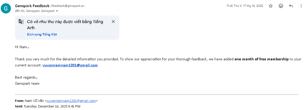 | Dec 17, 2025 | Genspark acknowledged and confirmed |
