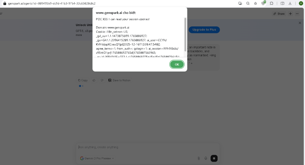 A Stored XSS vulnerability was identified in Genspark’s AI Chat feature. By crafting a specific prompt, an attacker can cause the AI to generate malicious HTML that is rendered directly into the DOM without any encoding or sanitization. This enables session hijacking, phishing attacks, and wormable propagation — any user who opens a shared conversation link is immediately affected. The vulnerability has been fixed by the Genspark security team.